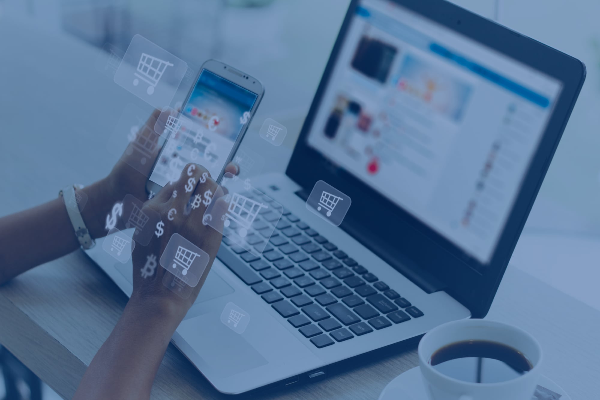 A person online shopping on their phone and laptop. Photo is overlaid with dollar signs and shopping cart icons.